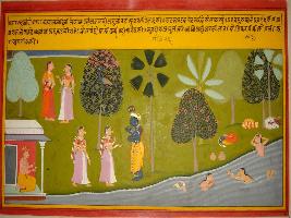 | Description / विवरण | Miniature painting based on Krishna charit - Sur Sagar depicting Rag Anakan .Surdas is shown sitting with Manjeera in his hand and narrating Krishna Lila. Two Gopis are shown standing at upper left. They are shown taking bath in Yamuna river, at lower left part. At the extreme middle part, they are shown with Krishna. |