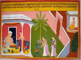 | Description / विवरण | Miniature painting based on Krishna charit - Sur Sagar depicting Rag Dhaneswari the ragini of Rag Sri. The painting depicts that Nanda is talking meal with little Krishna while Krishna is again depicts with Yashoda. On the upper left part of the painting Surdas is seen that playing Manjeera. |