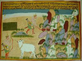 | Description / विवरण | Miniature painting based on Eklinga Mahatmya depicting a king talking to a cow and then he breaks his bow on a stone. |