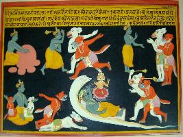 | Description / विवरण | Miniature painting based on Eklinga Mahatmya depicting Lord Vishnu and two demons in the upper row. In the lower row both the demons receive death when they go to attack Sheshshyayi Vishnu. |