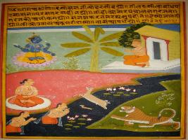 | Description / विवरण | Miniature painting based on Krishna charit - Sur Sagar depicting Rag Ankanu. On the upper part, Vishnu appear before Surdas, Who praying him. At the lower part, a man is depicted taking bath in a river and tiger running after a deer. |