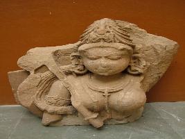 | Description / विवरण | It is a broken image of a goddess. She has a Jalamukut, with ear ornament, and necklaces Her nose is broken. Only the bust is present. She has floral lotus patel avamandal or pravamandal. Her left hand, ayudha and pravamandal is broken. The limbs are beautifully carved. |
