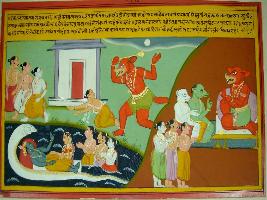 | Description / विवरण | Miniature painting based on Eklinga Mahatmya depicting that demon king Vratasur defeating Indra, Indra and the other deities go to Lord Vishnu and tell about Vratasur, then Lord Vishnu tells them to back to the heaven and serve him Vratasur . After it Vratasur becomes friend of Indra. |