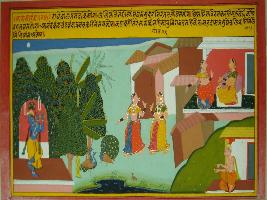 | Description / विवरण | Miniature painting based on Krishna charitra - Sur Sagar depicting Rag Saranga, son of Rag Megh. At the left side Krishna playing flute in the bower and gopis are coming out of their houses to meet him. |