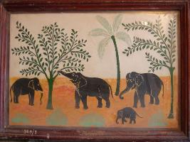 | Description / विवरण | Framed painting of elephants in forest, plucking branches from trees. |