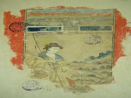| Description / विवरण | Miniature painting depicting an English lady with hat on her head and wearing a gown and shown catching fish from fish net. In her background, wall of a palace with plain fields and mounds are depicted. |