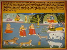| Description / विवरण | Miniature painting based on Krishna charit - Sur Sagar depicting Rag Kanpho. The painting depicts that by the Rag Kanpho everything is running very nicely. On the painting Mahadev is sitting with Parvati, Krishna with Radha and all other people along with animals are depicted in many satisfactory manner. |