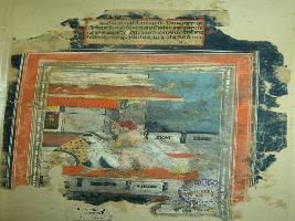 | Description / विवरण | Miniature painting depicting mating scene of a noble man and his wife on bed. |