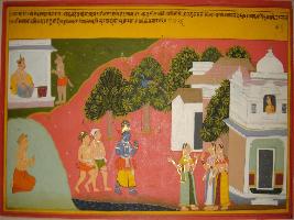 | Description / विवरण | Miniature painting based on Krishna charit - Sur Sagar depicting Rag Saranga, son of Rag Megh. Surdas is shown sitting with Manjeera in his hand and narrating a scene at lower right part. To his left, Krishna is shown coming with Gopas to Gokul nearby him, women of Gokul near by him, women of Gokul shown standing and talking among themselves. Behind them, houses are being shown, At the upper right part, Kansa is shown demon to kill Krishna. |