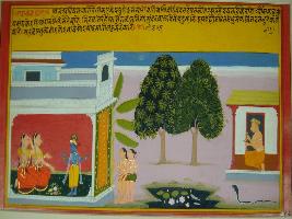 | Description / विवरण | Miniature painting based on Krishna charit - Sur Sagar depicting Rag Kando. On the painting Krishna is talking with his two mother Yashoda and Rohini while two Krishna s friend is waiting for him in the outside. Surdas is seen in the left side of the painting. |