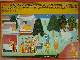 | Description / विवरण | Miniature painting based on Krishna charitra - Sur Sagar depicting Rag Kedar the Ragini of Rag Deepak. The paintings depicts that when Krishna play this Rag in his flute all the gopis come out from their house. |