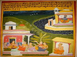 | Description / विवरण | Miniature painting based on Krishna charit - Sur Sagar depicting Rag Malhar, ragini of Rag Megh. On the upper part of the painting Krishna is depicted sitting in a palatial structure. In the lower part Radha is seen with her friends and Surdas is playing Manjeera. |