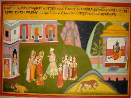 | Description / विवरण | Miniature painting based on Krishna charit - Sur Sagar depicting Rag Sarathi daughter in low of Rag Bhairav depicting a noble surrounded by gopis and at extreme left, loving union of Krishna and Radha is depicted. |