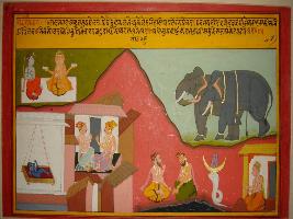 | Description / विवरण | Miniature painting based on Krishna charit - Sur Sagar depicting Rag Dev gandhar son of Rag Megh Shiv Brahma and childhood of Krishna is depicted. |