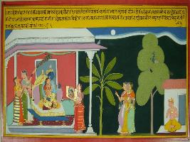 | Description / विवरण | Miniature painting based on Krishna charitra - Sur Sagar depicting Rag dev gandhar, son of Rag Megh. Krishna and Radha depicted sitting together with female attendants. One attendant is depicted showing their image to them. |