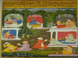 | Description / विवरण | Miniature painting based on Krishna charit - Sur Sagar depicting Rag Saranga, son of Rag Megh. On the top Krishna and Radha s holy union has been depicted, while in other part, Krishna sitting alone and two females in bower. |