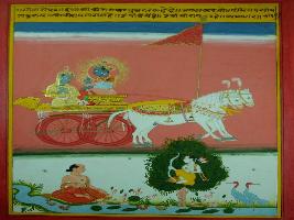 | Description / विवरण | Miniature painting based on Shri Bhagwat Gita. It depicts Krishna preaching Arjun that sages and Pundits conquered on their desires and senses if they tried. |