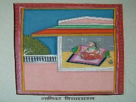 | Description / विवरण | It is a painting of a heroine in thought process. She is sitting on bed with the support of bolster Ma-sand . Sky is shown. |