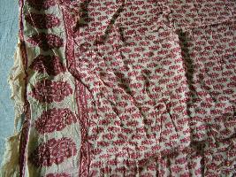 | Description / विवरण | This is a piece of cloth which is white colour and printed of red flowers and leaves. The edge of this cloth is having floral design within two horizontal cripple band. |