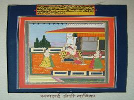 | Description / विवरण | It is a painting of a heroine in lethargic form. She has been shown in dancing posture. Two attendants has been shown beside her left and right . |