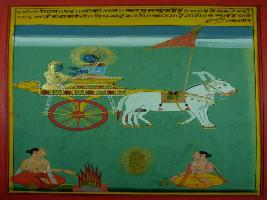 | Description / विवरण | Miniature painting based on Shri Bhagwat Gita. It depicts Krishna preaching Arjun that who loves all, who does not think bad for others and know his own soul will attain moksha. |