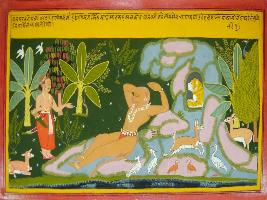 | Description / विवरण | Miniature painting based on Mahabharat - Vana parva. This painting shown that in the Uni vana animals are running peacefully and Hanuman also resting there where Bhim meet him. |