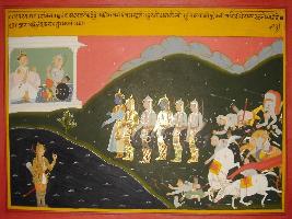 | Description / विवरण | Miniature painting based on Mahabharat - Gada parva. The painting depicts Dhitasastra and Sanjay. Where Sanjay is informing him about the conversation of Druodhana and Yudhisthir regarding the topic of rajya. On the painting depicts the said story. |