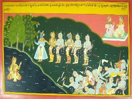 | Description / विवरण | Miniature painting based on Mahabharat - Gada parva. Duryodhan is depicted hiding in the pond. Krishna come with Pandavas and telling Duryodhan that all your peoples, freinds are dead, whyhe is hiding in water why he is critisizing bravery. |