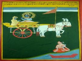 | Description / विवरण | Miniature painting based on Shri Bhagwat Gita. It depicts Krishna preaching Arjun that he who has control over his senses, his mind is controlled by intelligence in the way flow of air controls a boat. |
