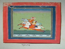 | Description / विवरण | It is a painting of horse race. Two horses are shown in racing posture. One horse is lead by a man and the other by a female. Bridle is shown on both horses. |