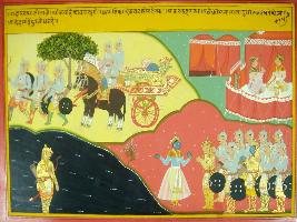 | Description / विवरण | Miniature painting based on Mahabharat - Gada parva, Duryodhan is depicted in the pond. Pandavas are depicted coming towards the pond with Krishna seeing this Krithvavma, Kripacharya and Aswathama hide themselves behind a tree and Krishna is depicted telling Yudhisthir that Duryodhan is hiding is this pond. |