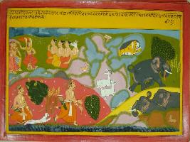| Description / विवरण | Miniature painting based on Mahabharat - Vana parva depicting that Bhim is shaking the whole earth with his power. He is depicted going forward by uprooting the trees and frightening wild animals. Even rain has started due to his activities. On the upper right apsaras and devpurushs are depicted. |