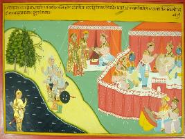 | Description / विवरण | Miniature painting based on Mahabharat - Gada parva. Duryodhan is depicted in the pond and he is talking to Kritrama, Kripacharaya and Aswathama on the and other side Bhim is depicted taking blessings for his fight with Duryodhan from Krishna and Yudhisthir. |