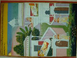| Description / विवरण | Miniature painting based on Krishna charit - Sur Sagar depicting a man opening the door of palace and inside the palace, women is shown sleeping on bed at extreme right. At the extreme left, he is shown entering the palace and at the top left he is shown sitting with a woman at the palatial window. |