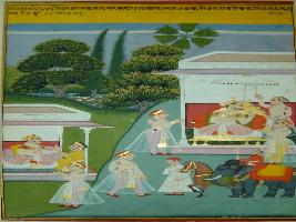 | Description / विवरण | Miniature painting based on Krishna charit - Sur Sagar depicting sitting on throne with chauri bearer near by at the upper left part. One of his noble is standing with folded hand in front of him. His noble is shown leaving. |