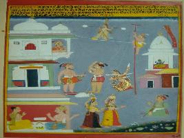 | Description / विवरण | Miniature painting based on Krishna charit - Sur Sagar depicting Rag Bilawal, ragini of Rag Hindol depicting arts by Natas, they are performing their art in front of a king in palace. On the other side of palace is the temple of Vishnu. |