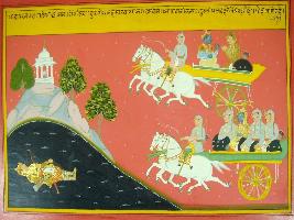 | Description / विवरण | Miniature painting based on Mahabharat - Gada parva. Duryodhan is depicted hiding in the waters of pond and Krishna and Pandavas are depicted coming in search of him. |