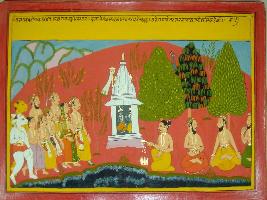 | Description / विवरण | Miniature painting based on Mahabharat - Vana parva. Pandavas with Draupadi depicted coming to a temple. Many sages are depicted sitting in front of a temple and one sage is depicted performing yagna. |
