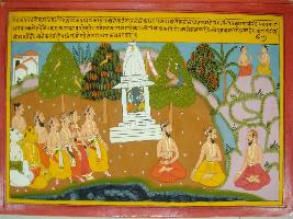 | Description / विवरण | Miniature painting based on Mahabharat - Vana parva depicting Pandavas are arriving in hermitage of sages for worship and find many birds, animals over there. Finally they get the glimpse of Nar-Narayan. |