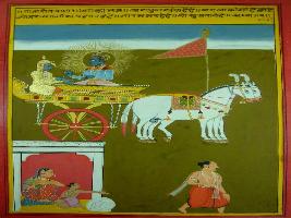 | Description / विवरण | Miniature painting based on Shri Bhagwat Gita. It depicts Krishna preaching Arjun one who scarifies all worldly desires and behaviours. |