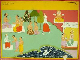 | Description / विवरण | Miniature painting based on Mahabharat - Gada parva depicting Balram is going to tirtha taking bath in holy river and giving daan to Brahman. At the upper right part, sage is shown talking to disciple. |