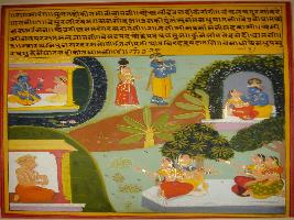 | Description / विवरण | Miniature painting based on Krishna charit - Sur Sagar depicting Rag Saranga, son of nag Megh. On the upper part Vishnu is depicted with a noble, Krishna playing with Radha and making love with Radha. On the lower part four friends of Radha are depicted and Surdas is depicted on Lower left corner. |