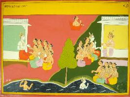 | Description / विवरण | Miniature painting based on Mahabharat - Gada parva depicting Balram is going for tirtha. He is shown taking bath in holy river. |