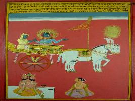 | Description / विवरण | Miniature painting based on Shri Bhagwat Gita. It depicts Krishna preaching Arjun that who think about him then he get Mukti in his last time. Here the 2nd Adhyaya came to end and this painting is belongs to king Jai Singh and this painting was made by Bhat Kishan Das. |