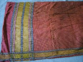| Description / विवरण | North west frontier, red and yellow colour. Two clothes are stitched together, the lining is green colour cloth. The outer cloth is square cubes design of which one end is plain and the other end is of two horizontal chivern pattern; the gap between these pattern is yellow colour. the edge of the cloth is of geometric design of three band horizontal . Yellow, pink, red and black colour threads used. there are some cut in the cloth. |