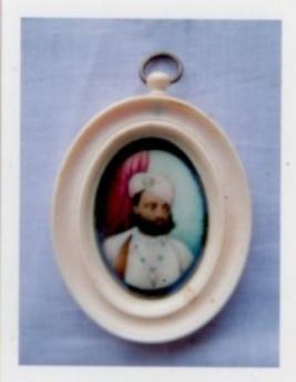 | Description / विवरण | Bust of King Madhav is painted on oval shaped ivory of sky and partly red ground. He is wearing chain of white mat is with red and green precious stones and a locate. His turban is of light purple colour and clothes are white colour. |