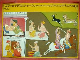 | Description / विवरण | Miniature painting based on Mahabharat - Udyam parva depicting Bindura whose son is very powerful and a great conqueror. It also depicts he is talking with his friends and defeating the enemies. |