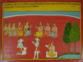 | Description / विवरण | Miniature painting based on Mahabharat - Vana parva. Pandavas with Draupadi is depicted sitting with three sages and Bhim is calling Ghatotkach and he is coming on his fathers call. |