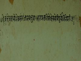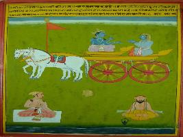 | Description / विवरण | Miniature painting based on Shri Bhagwat Gita depicting Krishna preaching Arjun that he who with his knowledge understand the secrets of Kshetra will attain moksha. Here the 23 Adhyaya is finished that is written during the rein of Maharana Jai Singh. |