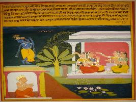 | Description / विवरण | Miniature painting based on Krishna charit - Sur Sagar depicting Rag Malhar, the Ragini of Rag Megh depicting Krishna playing flute and four gopis are become crazy by the hearing the Krishna s melodious of music. |